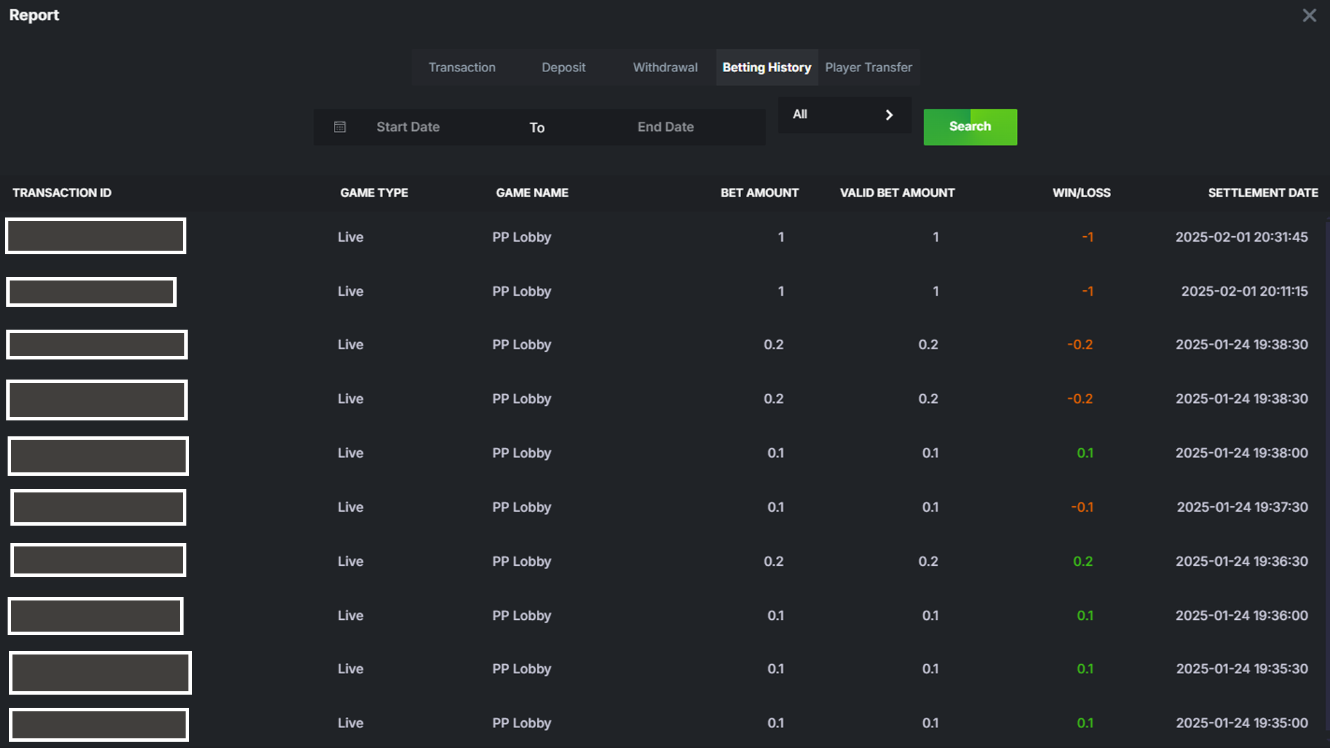 - Transaction ID: 6793xxx - Game Name: PP Lobby - Bet Amount: 0.2 - Win/Loss: -0.2