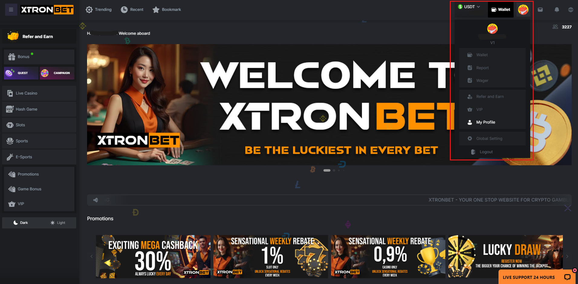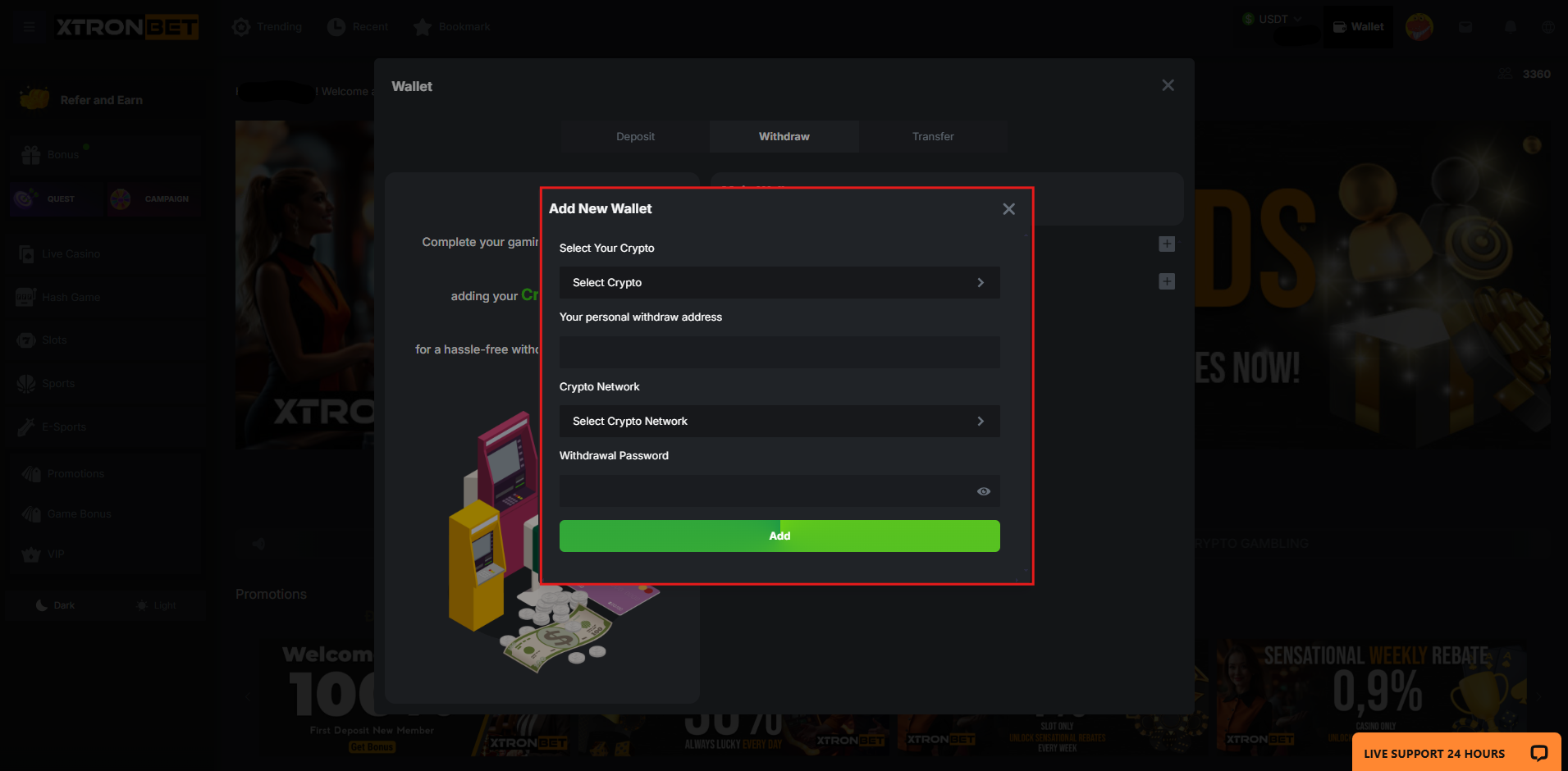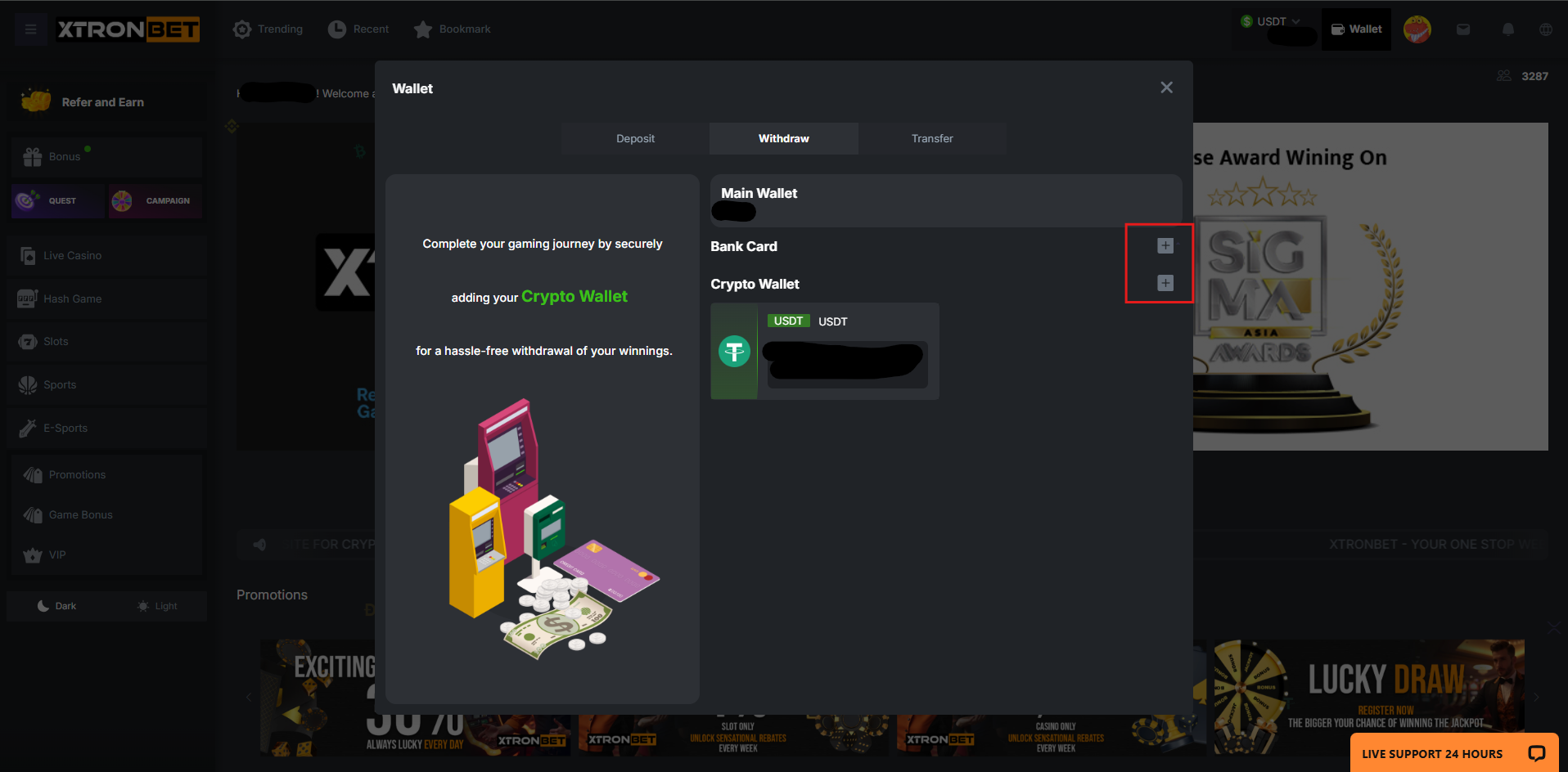 Once this process is complete, you can use the registered wallet address or bank card to withdraw funds securely and quickly on XTRONBET.