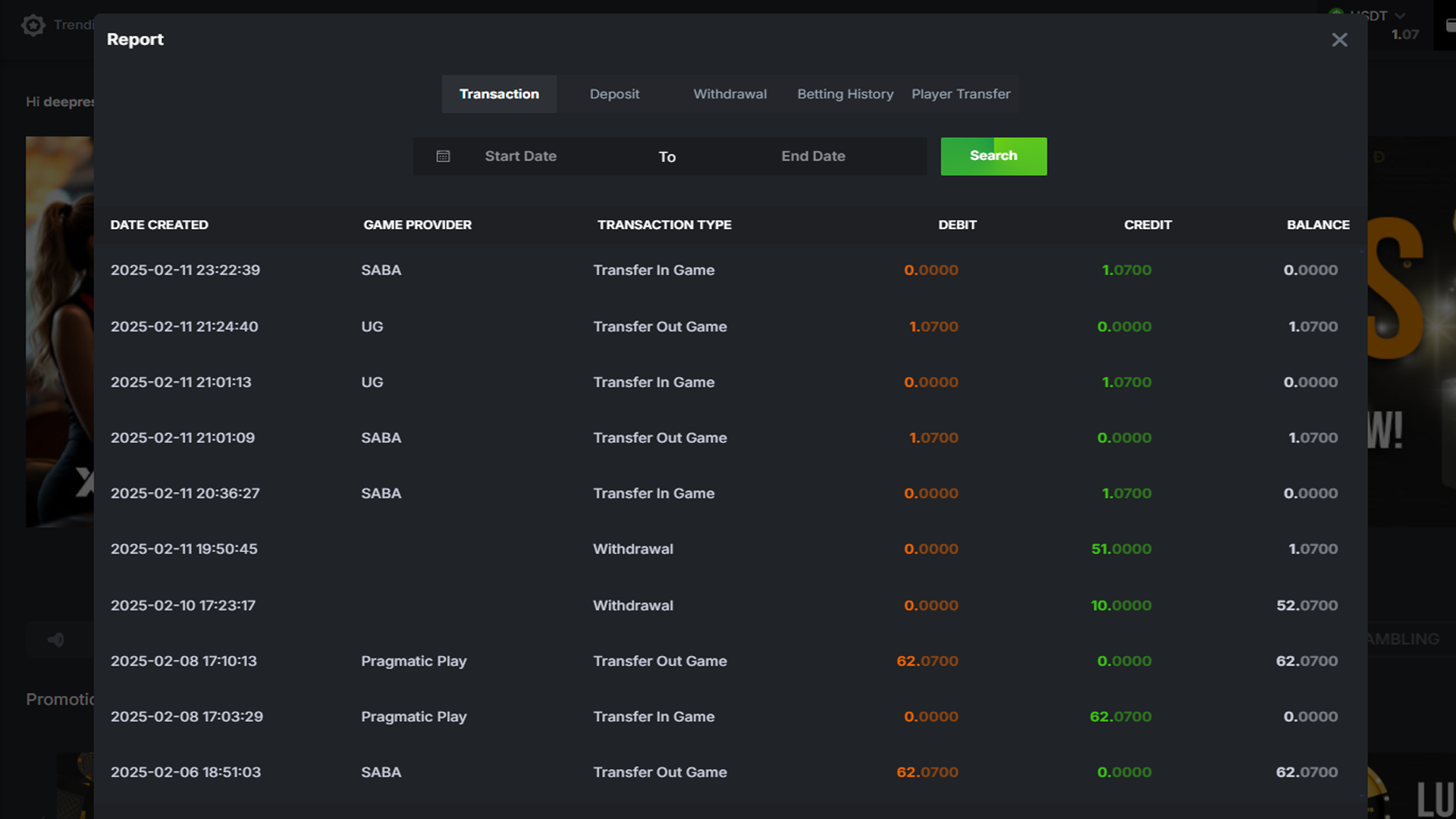To view the transaction report, simply log in to your XTRONBET account and select the "Report" or "Transaction" option from the menu. From there, you can enter the desired time period, either based on start and end dates, and choose the type of transaction you want to view (e.g., "Deposit", "Withdrawal", or "Player Transfer").